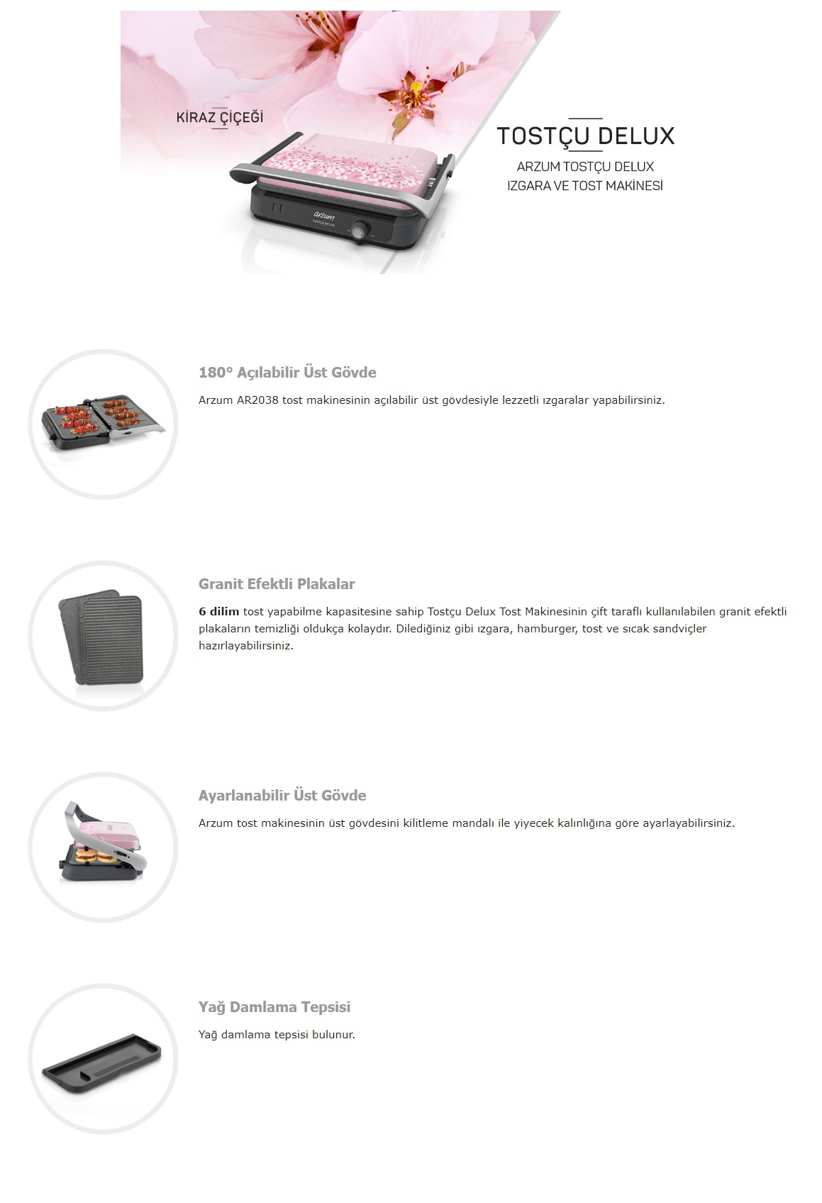 Arzum Tostçu Delux 1800 Watt Izgara ve Tost Makinesi Kiraz Çiçeği AR2038
